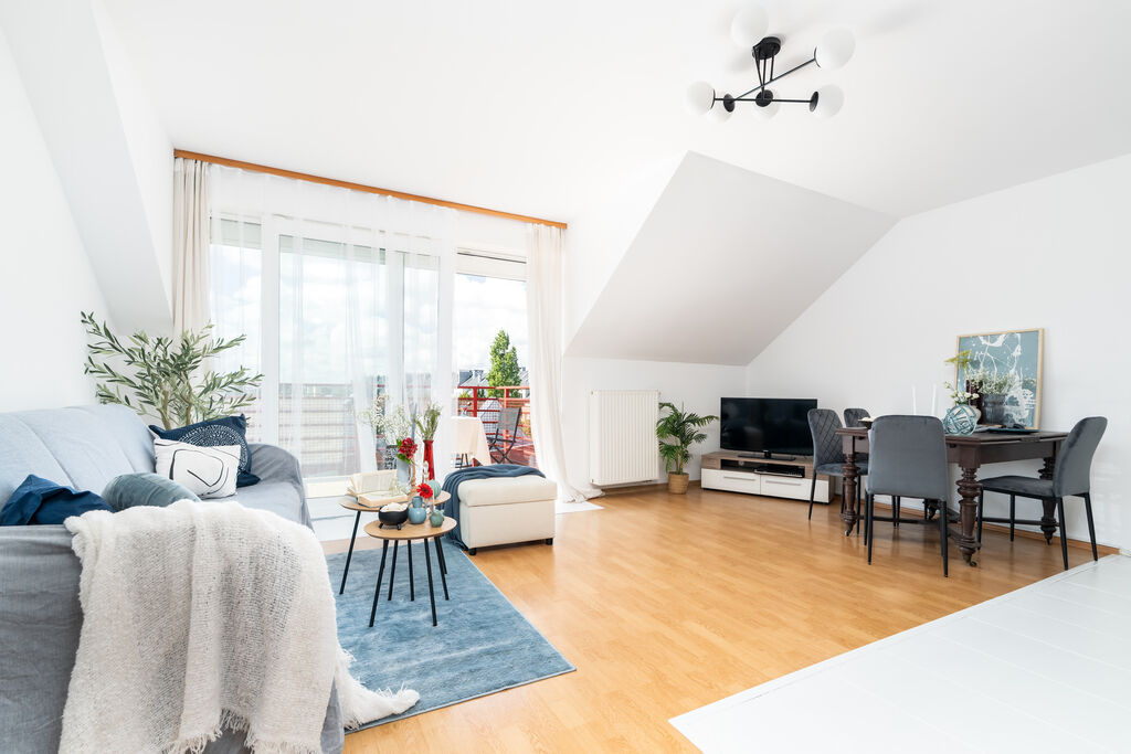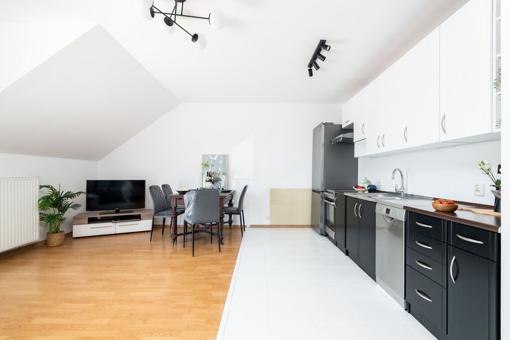 – Przestronny salon z aneksem kuchennym i wyjściem na balkon